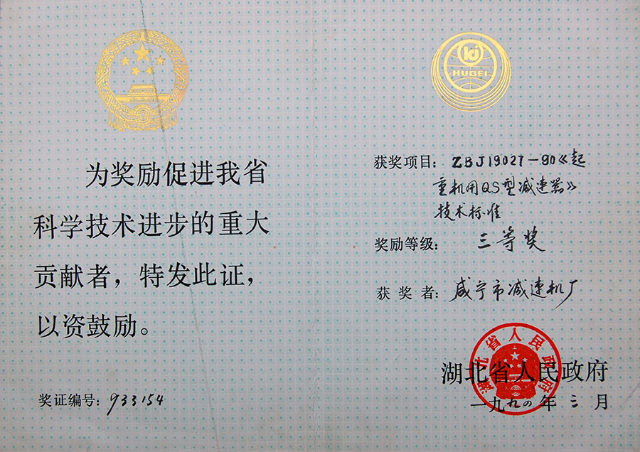 :QSC系列三合一減速機湖北省科技進步三等獎